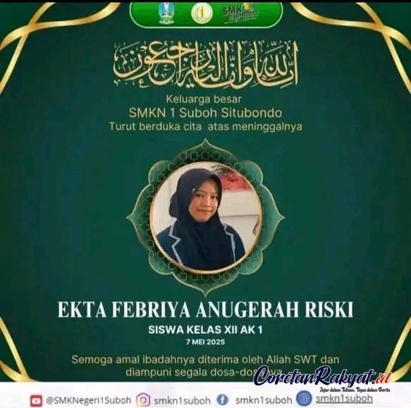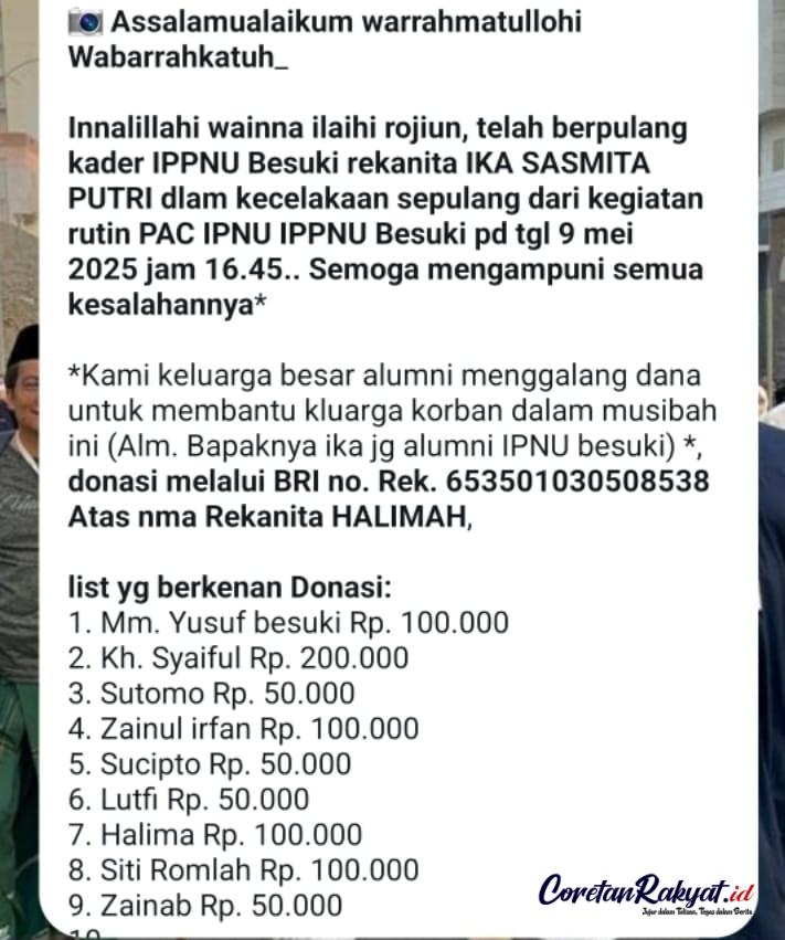 Coretanrakyat.id Besuki, Situbondo – Minggu, 11 Mei 2025: Duka mendalam yang dirasakan oleh keluarga besar Ketua Umum LSM Siti Jenar, Eko Febriyanto, akibat wafatnya putri tercinta Ekta Febriya Anugerah Risky, justru dinodai oleh aksi kriminal tak bermoral. Seorang oknum tak bertanggung jawab memanfaatkan tragedi ini sebagai sarana penipuan, dengan modus meminta donasi melalui pesan berantai di media sosial, khususnya WhatsApp Group (WAG).