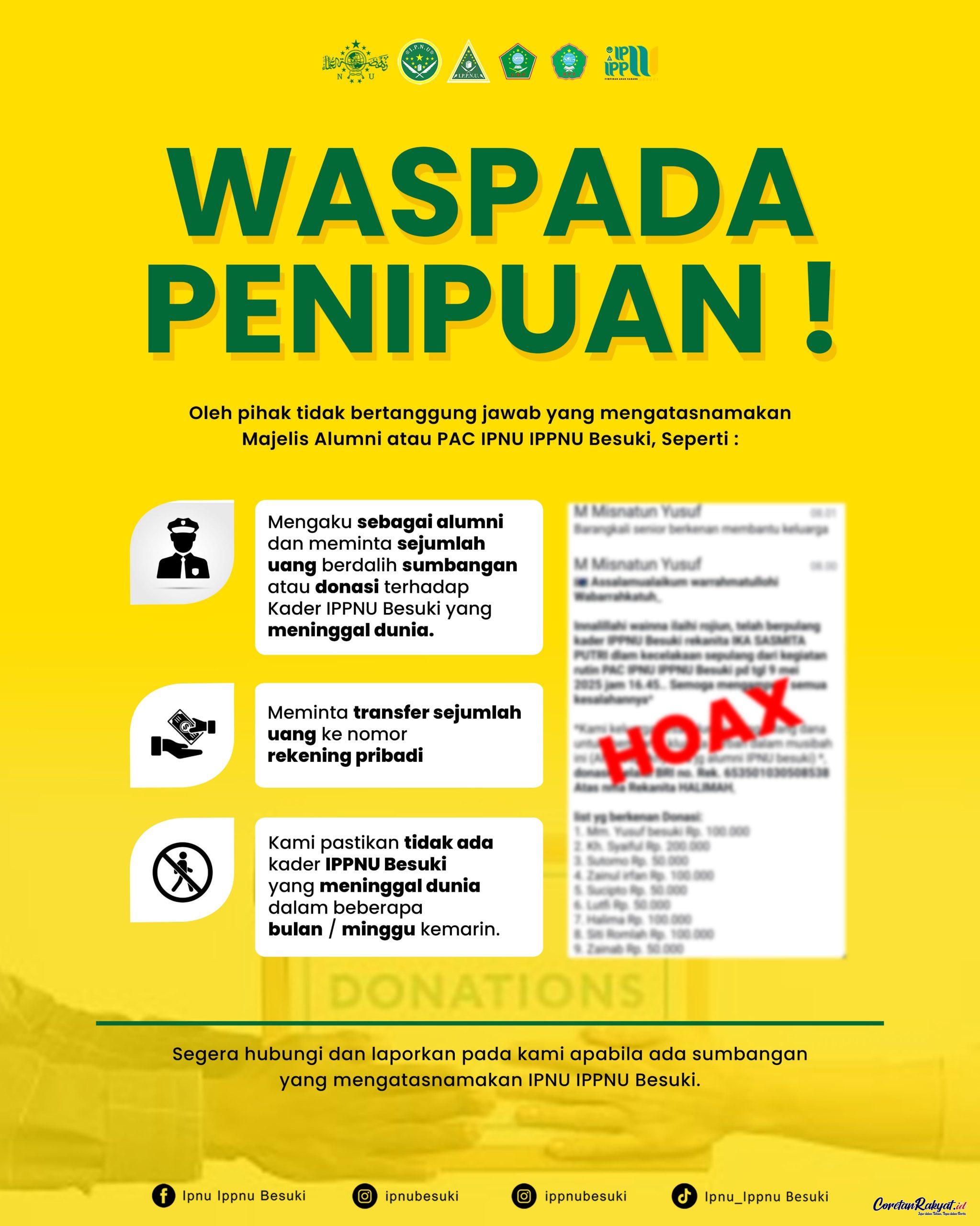 “Ini adalah bentuk pencemaran nama baik yang serius. Kami tidak pernah menyebarkan permintaan donasi dan tidak memiliki afiliasi dengan pelaku. Tindakan ini murni penipuan yang memanfaatkan nama IPPNU demi kepentingan pribadi,” jelas salah satu pengurus IPPNU di Besuki.