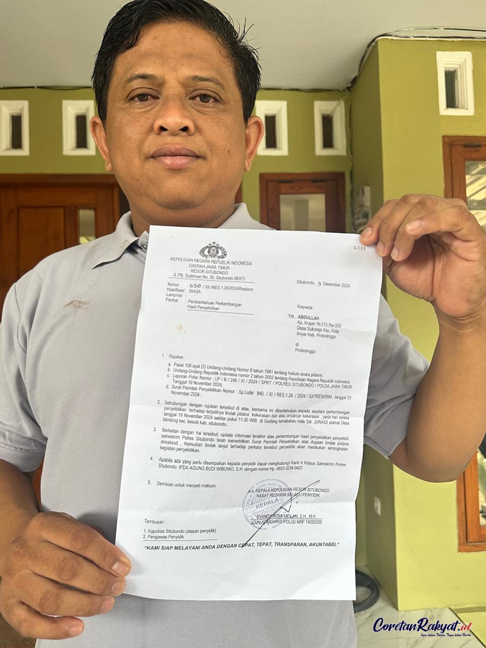 Coretanrakyat.id Situbondo Jatim Kamis 12 Desember 2024: Abdullah, warga Dusun Kp. Krajan, Desa Sukorejo, Kecamatan Kota Anyar, Kabupaten Probolinggo, mengungkapkan kekecewaannya terhadap lambannya penanganan laporan dugaan kekerasan yang dialaminya oleh Polres Situbondo. Abdullah mengaku tidak mendapatkan kepastian hukum dalam kasus yang ia laporkan 1 bulan lalu.