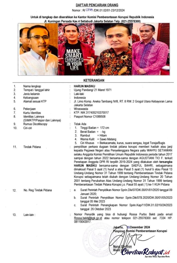 Coretanrakyat.id Jakarta Senin 9 Desember 2024: Terbaru Komisi Pemberantasan Korupsi (KPK) Kembali memasukkan nama tersangka HARUN alias Harun Masiku yang juga Politikus PDI Perjuangan dalam Daftar Pencarian Orang, karena dinilai Sangat tidak kooperatif setelah dilakukan tiga kali pemanggilan pemeriksaan sebagai tersangka.