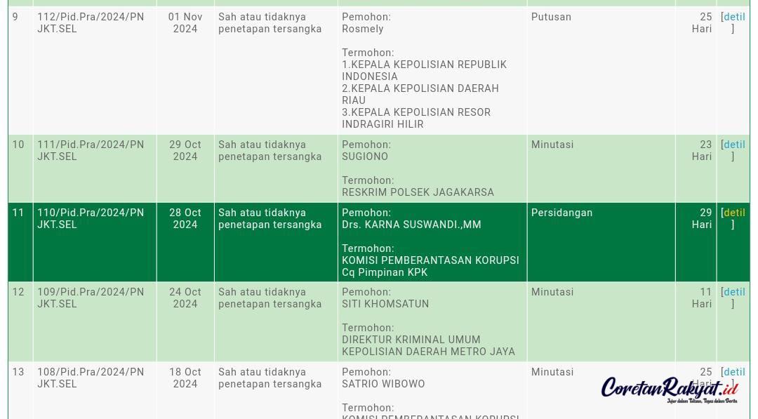 Coretanrakyat Situbondo Jatim Selasa 26 November 2024: Lagi- lagi Dan Lagi Kandas Sudah Keinginan Karna Suswandi Untuk Lepas Dari Jeratan Korupsi Pasca Sore Ini PN Jaksel Kembali Menolak / Kembali Tidak Menerima Permohonan Praperadilannya Perkara nomor 110/Pid.Pra/2024/PN. JKT. SEL nah Dengan Demikian Sekali ini Membuktikan Penetapan Tersangka yang dilakukan KPK Terhadap KARNA SUSWANDI sudah dipastikan Sangat SAH Menurut Hukum.